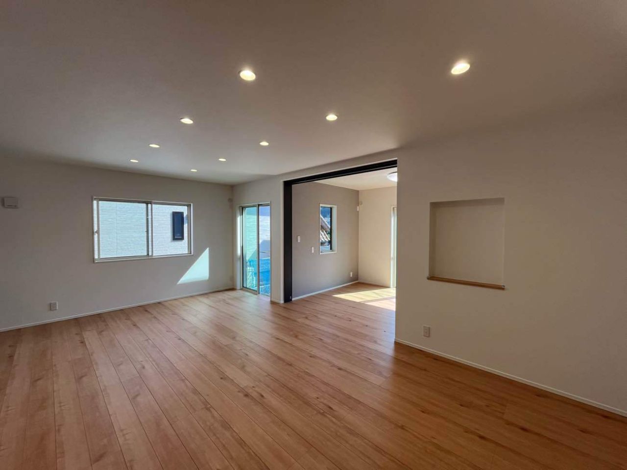 リビングと隣接する洋室の引き戸を開けるとキッチン・ダイニング・リビングが一体となり、自然光がたっぷり入った明るいリビングは家族のくつろぎ時間をより心地よく演出します☀️